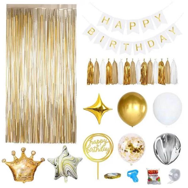 60 balona raznih boja; 1x balon u obliku krune; 2x balona u obliku petokrake zvijezde; 2x balona u obliku četverokrake zvijezde; 1x zavjesa od svjetlucavih traka; 1x banner za sretan rođendan; 5x set šarenih ukrasnih resica; 1x Happy Birthday ukras za tortu; Ukrasna traka, pribor za vezivanje balona, ljepilo i traka za pričvršćivanje balona.